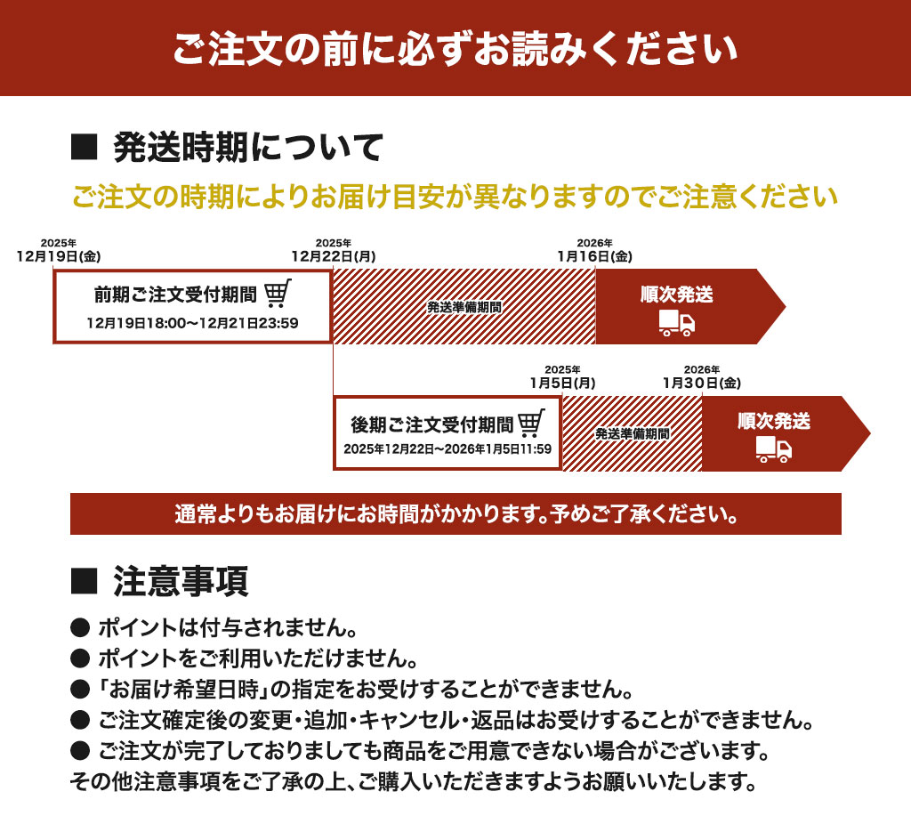 • カートの仕様上、「お届け希望日」をご入力いただくことは可能ですが、年明けより順次発送予定です。通常よりお時間がかかりますのでご理解の程お願いいたします。