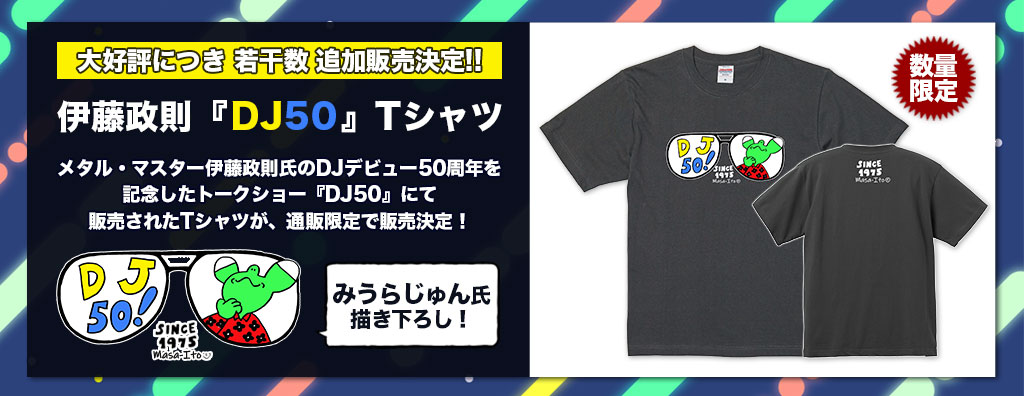 みうらじゅん氏描き下ろし!特殊カラー7版仕様MASA ITO DJ50周年記念スペシャルTシャツ! 我らがメタル・マスター MASA ITOこと、伊藤政則氏のDJデビュー50周年を記念したトークショー『DJ50』にて販売された記念Tシャツ。 ファンからの熱い要望にお応えし、通販での数量限定販売が実現!